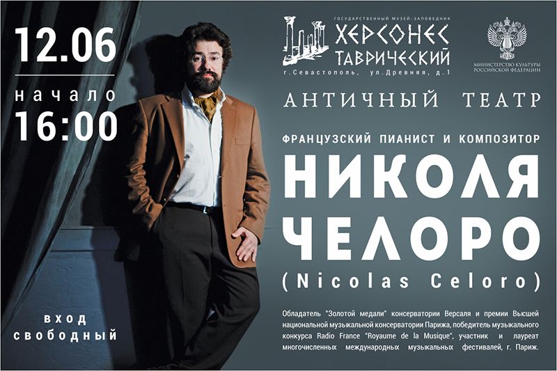 Пианист и композитор из Парижа, лауреат международных конкурсов Николя Челоро 12 июня в 16:00 даст единственный концерт в Крыму, который состоится в Античном театре Государственного музея-заповедника «Херсонес Таврический».